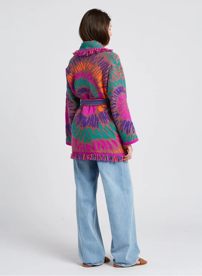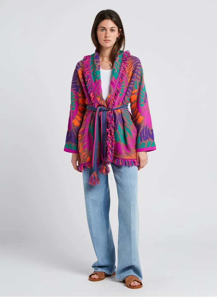 Ce modèle est présenté avec Top col classique en cachemire by KUJTEN, Jean boyfriend taille haut en coton recyclé by CLOSED, Sandales plates en cuir by BERENICE, Echarpe imprimée en cachemire by KUJTEN