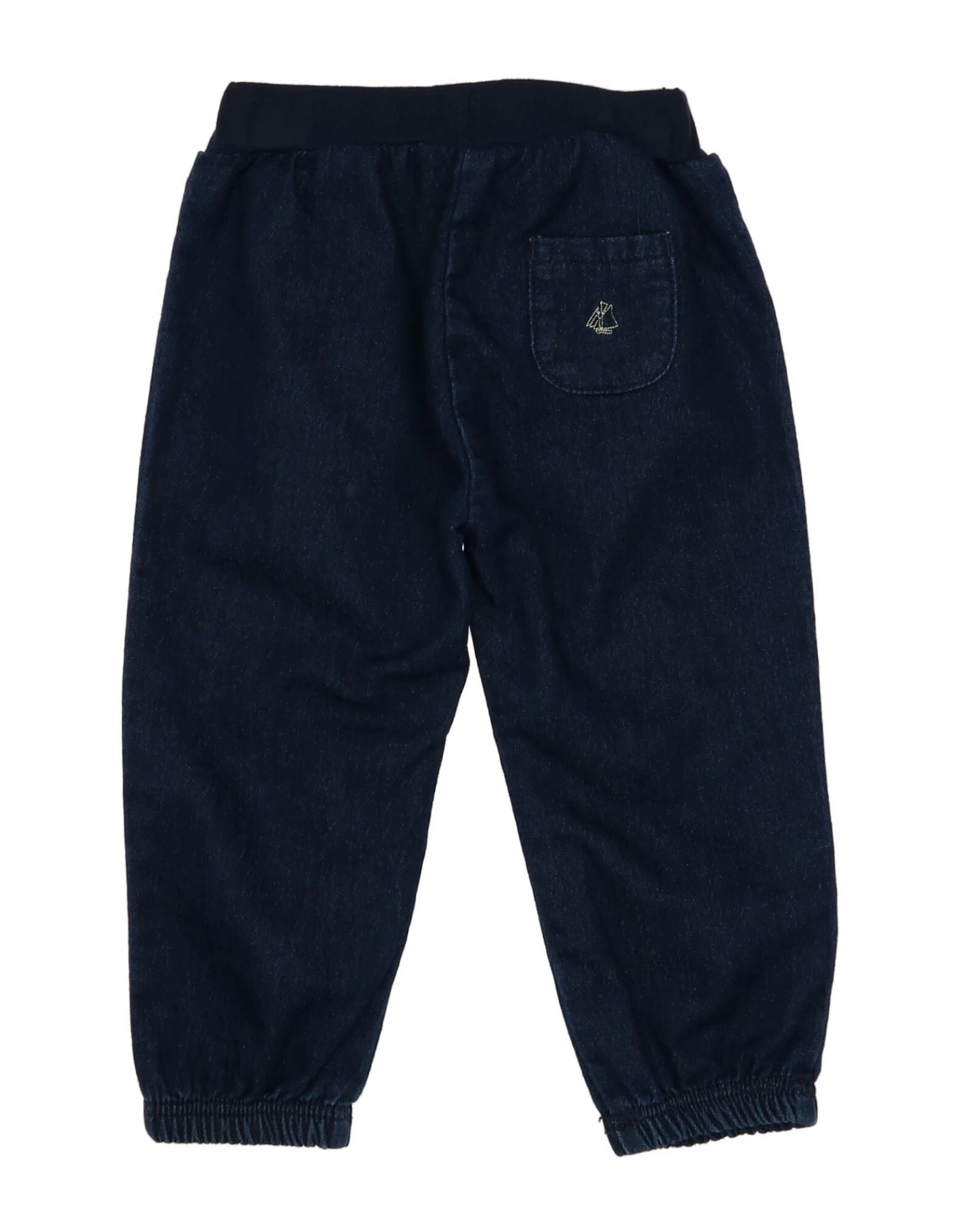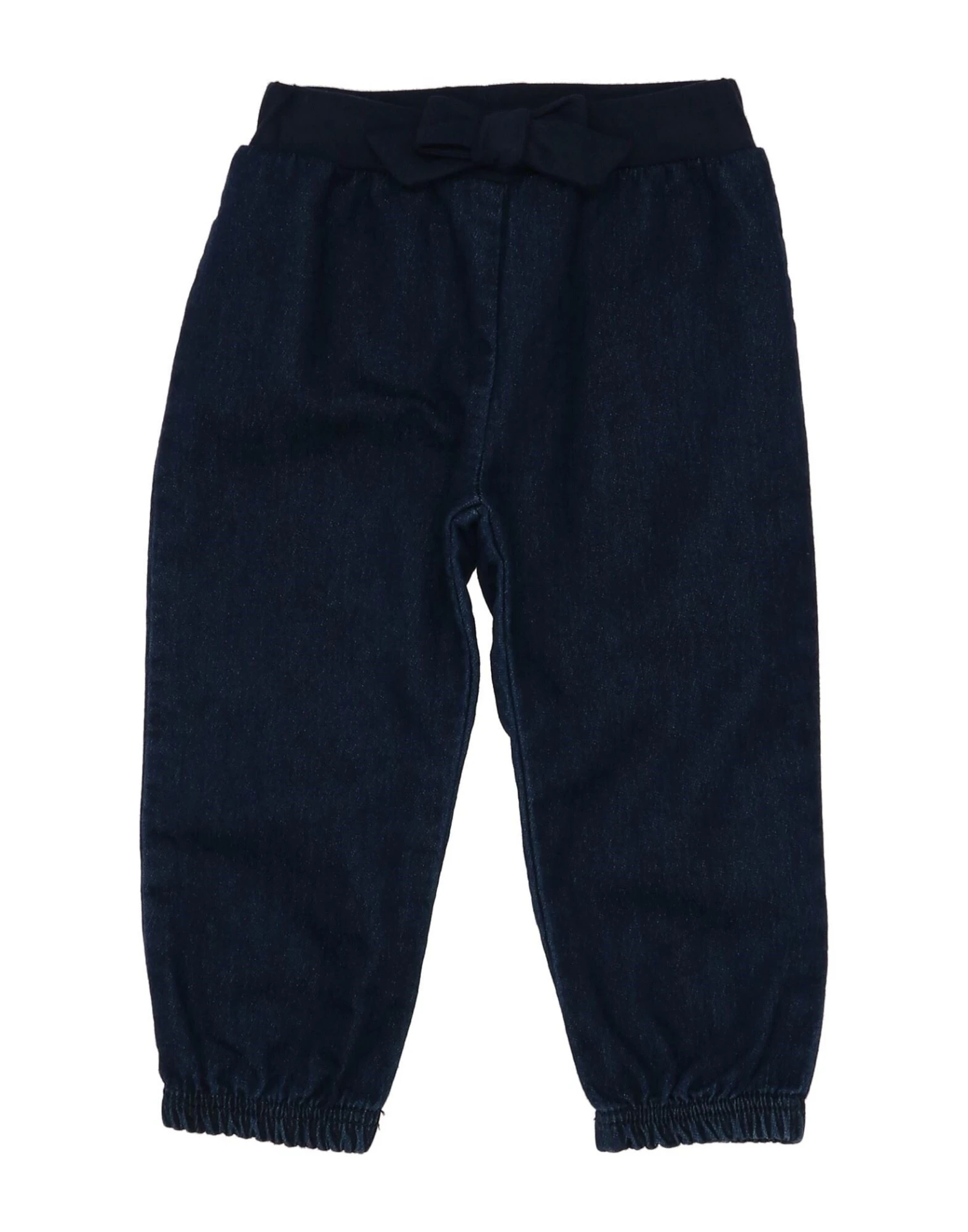 coton denim, logo de la marque, nœud, uni, lavage foncé, évasés, élastique à la taille, sans poche, laver à 30°, ne pas utiliser de javel, non lavable à sec, ne pas sécher en machine, repasser à max 110°