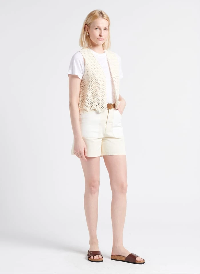 Ce modèle est présenté avec Short en jean taille haute by PIECES, Ceinture en cuir by GERARD DAREL, Mules plates en cuir by SOEUR, Gilet court en coton by SUD EXPRESS